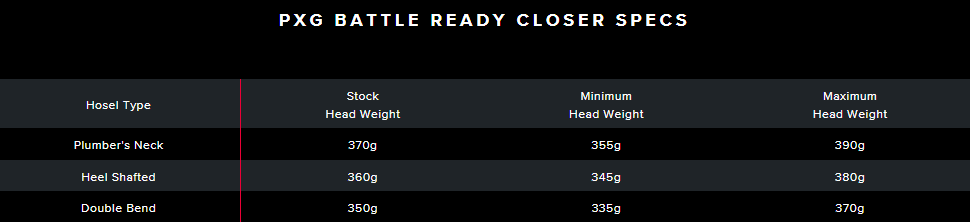 ① 高密度鎢元素嵌入:產生更高的MOI與容錯性② 配重技術:可調式桿頭重量:具4顆可調整之配重螺絲,並根據量身訂製所選之桿頸,達到最適合球手的桿頭平衡。③ 頸與長度部分可量身訂製,桿頸隨著推桿軌跡之不同,有以下三種選項: