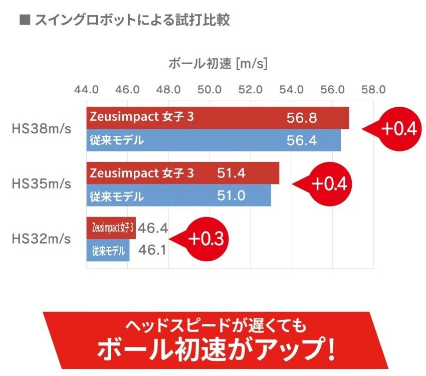 日本製造的 2 核 1 殼 3 片結構球,即使在女子球桿頭速度下,也能以高反彈力擊出又直又遠的球。它沒有高反彈球常見的堅硬手感,而是具有女性喜歡的柔軟手感。
