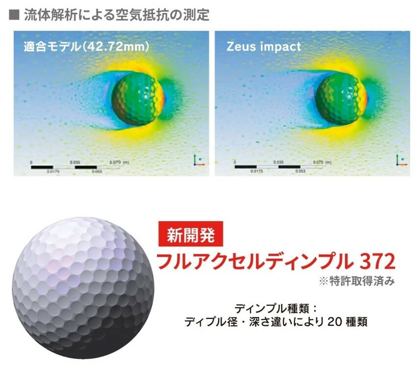 直徑42毫米的小尺寸,比官方用球減少2.0%的空氣阻力,即使在對抗時也能提供強大的彈道。此外,新開發的“Full Axel Dimple 372”提高了向前推進力。即使以女子的桿頭速度,您也可以將球飛得很遠。