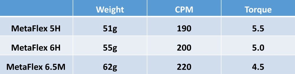 ● MetaFlex CBT 6.5M 的工廠設計重量為 62g, 220 cpm 和 4.5 torque。