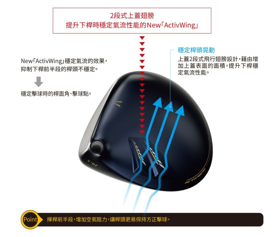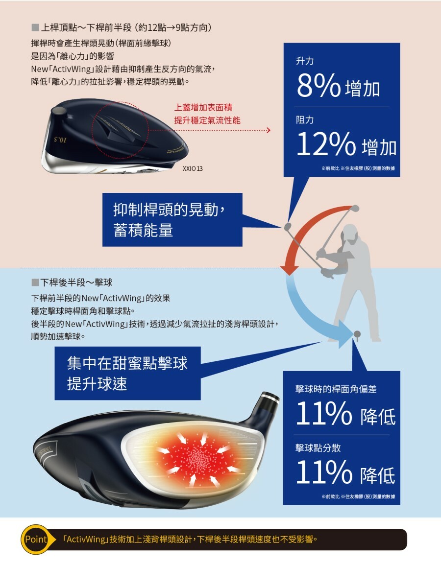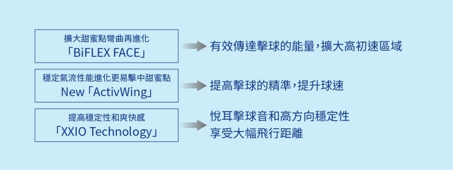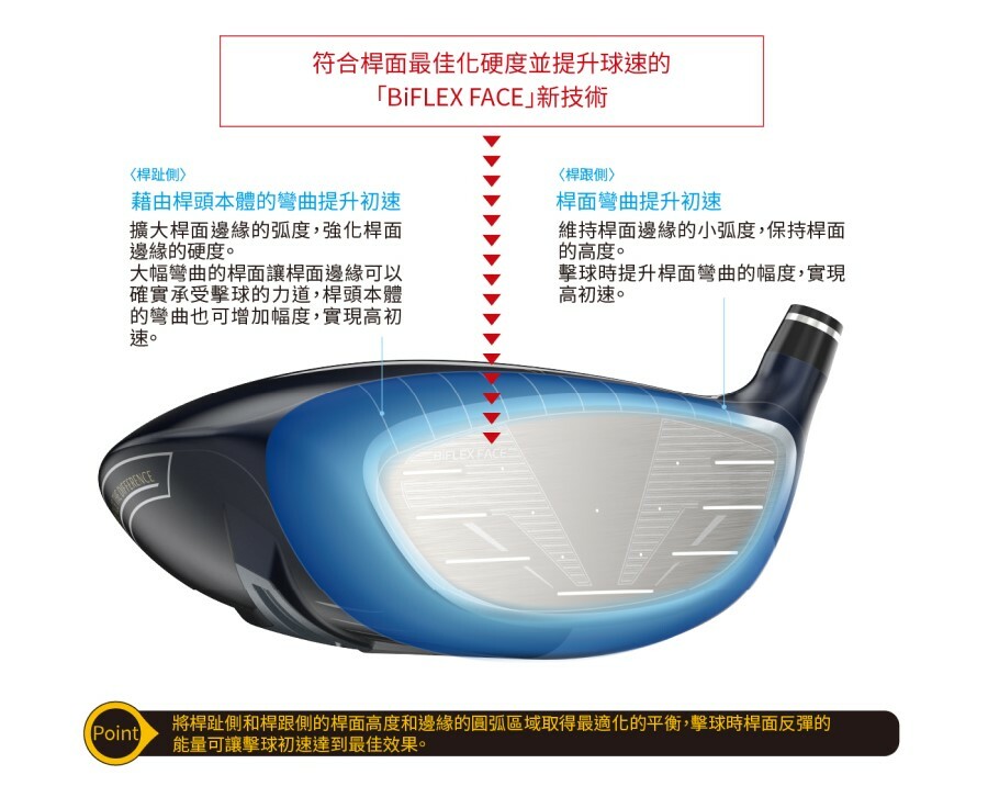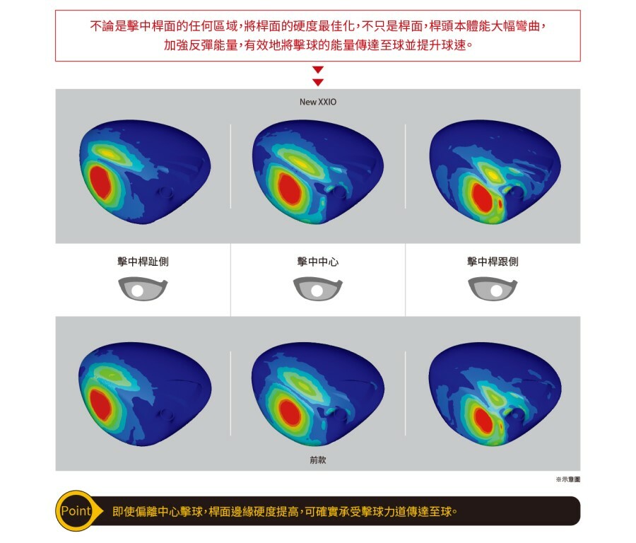 不論是從中心或是偏離中心擊球,都能擴大擊球時的桿面彎曲幅度,擴大高初速區域的新開發技術。