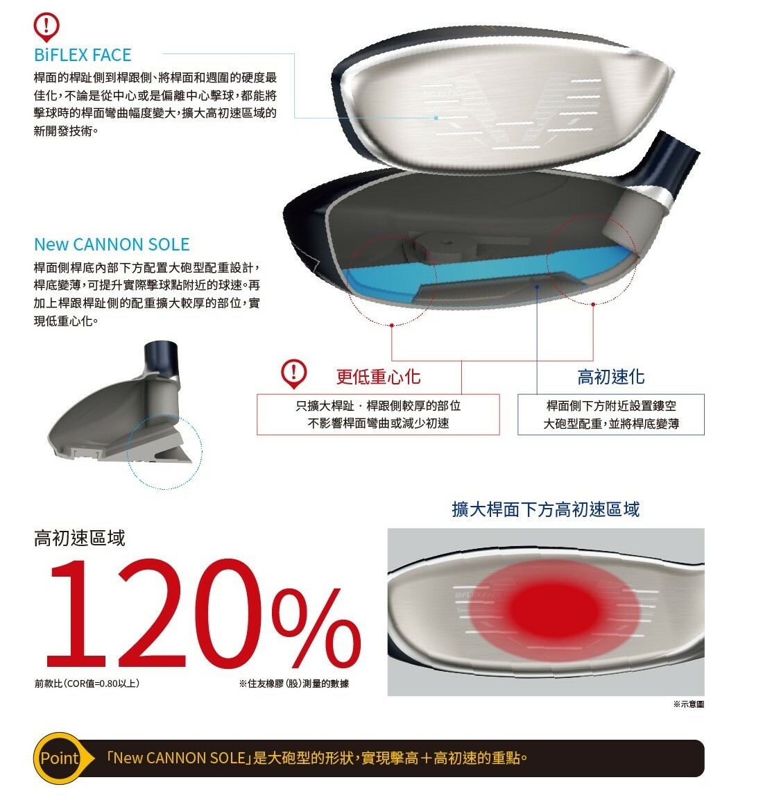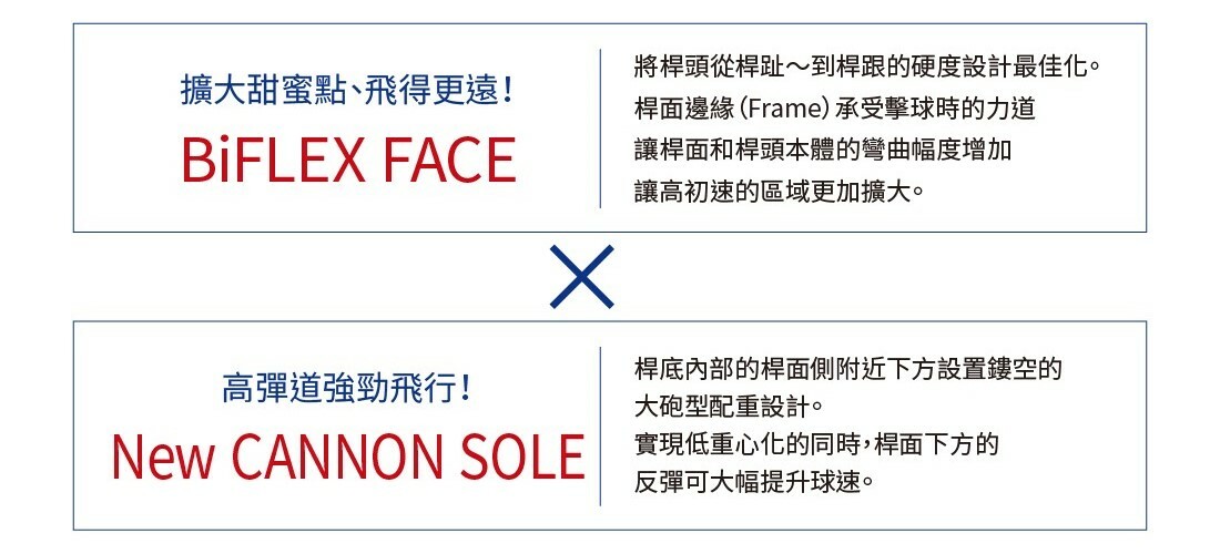 "新"技術「BiFLEX FACE」及 "進"化技術「New CANNON SOLE」引導高又強勁彈道的混血木桿。