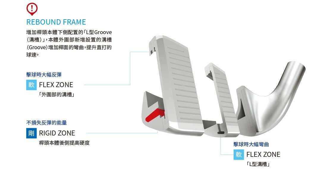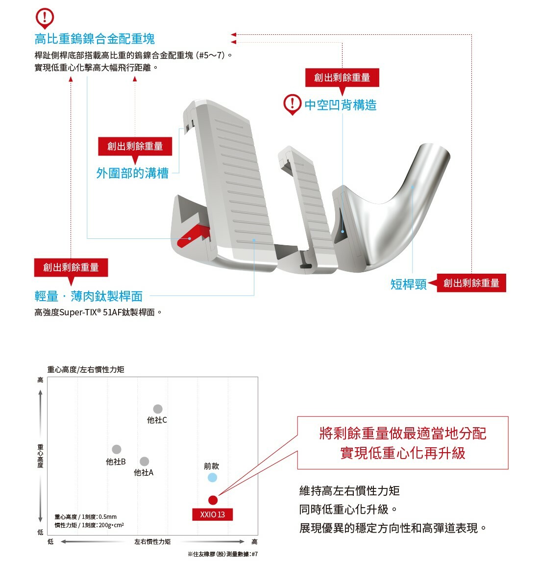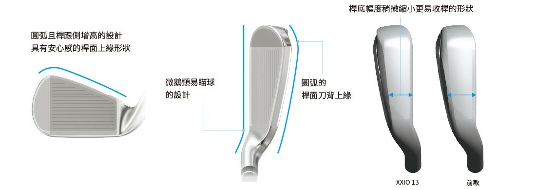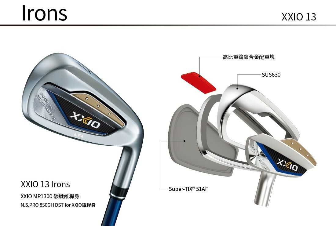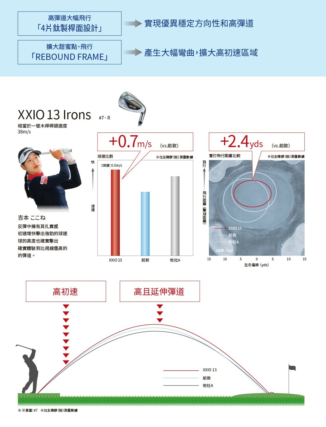 鈦製桿面的4片複合構造,徹底化的低重心設計和IRON版的「REBOUND FRAME」創造擊高且延伸的彈道,XXIO13鐵桿易打性佳可擊出大幅飛行距離