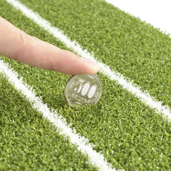 透過使用密度約為1.8倍*1的人造草皮,我們再現了與佔據日本高爾夫球場約90%的彎曲草皮相似的球滾動。刺激計測量為 11.8 英尺*2,讓您體驗球在高速果嶺上的滾動。此外,在墊子中央用編織的白色人造草繪製了兩條間隔 6 公分的引導線(對齊線)。透過反覆練習“拉直、打直”,同時將推桿對準線路,您將能夠直觀地看到推桿時的重要方向,並學會穩定地推桿。