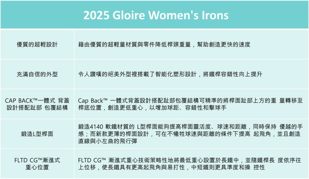 2025 全新 Glory Iron 採用優質超輕量複合材料製成,使其更輕、桿頭速度更快,以實現最佳距離。