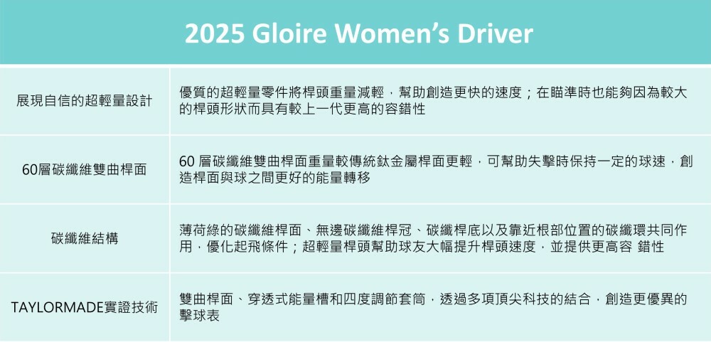 2025 全新 Glory Driver 採用優質超輕碳材料,提供輕盈運動。此外,更大的桿頭設計可提供瞄準時的穩定性,更快的桿頭速度可達到最佳距離。