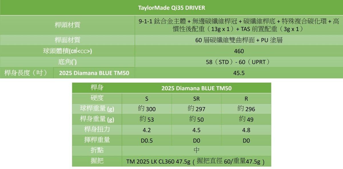 Qi35 設計師系列具有來自 TaylorMade 最具創意的設計師的獨特美學。設計師系列發球桿具有豐富、深邃的光澤和微妙的綠色亮點,帶來獨特的魅力。