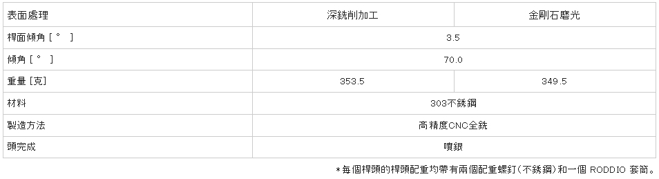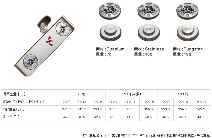 桿頭主體由303不銹鋼製成,提供獨特而舒適的擊球手感。質量是通過全銑方法精確而精心切割的。RODDIO的第一款推桿頭,滿足了推桿最重要的性能,即精準的方向和距離,是一款完美度極高的產品。